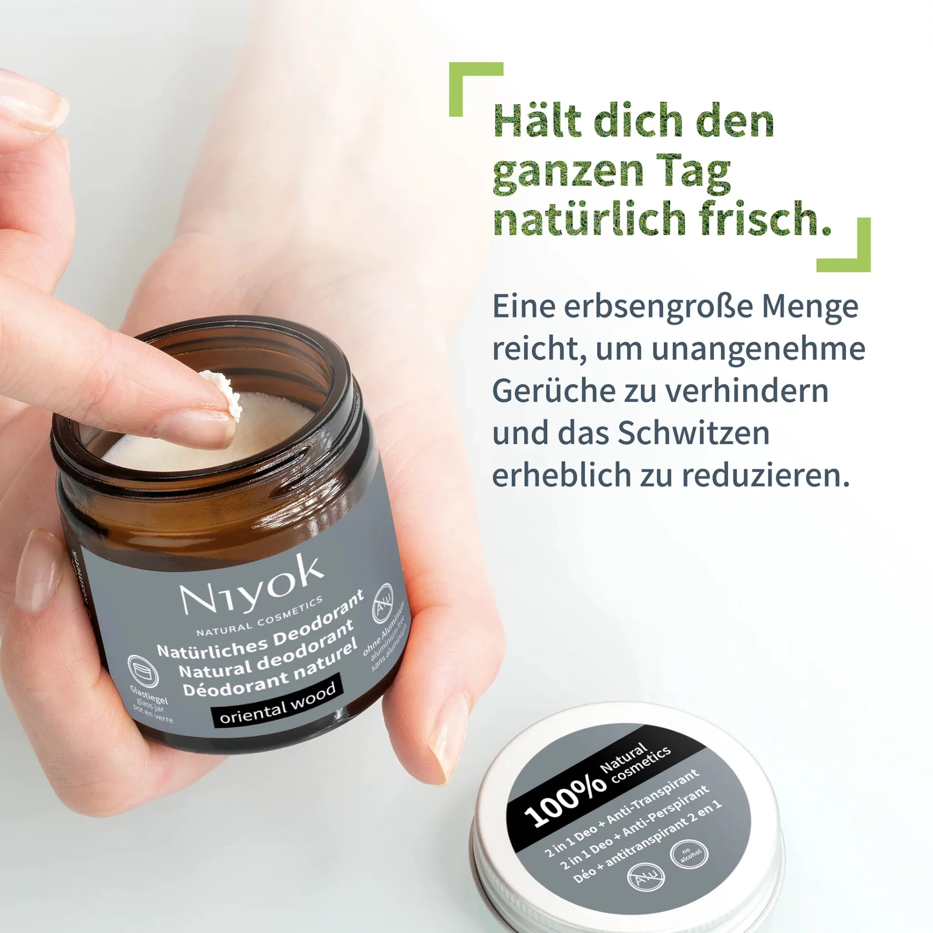 Die 2-in-1 Deodorant Creme "Oriental Wood" von Niyok bietet intensiven Schutz vor unangenehmen Gerüchen und pflegt zugleich die empfindliche Achselhaut – ganz ohne Aluminium oder synthetische Zusätze. Der Duft entfaltet eine kraftvolle Komposition aus holziger Basisnote und würzig-aromatischer Tiefe – warm, selbstbewusst und erdend. Die cremige Textur auf Basis von Bio-Kokosöl und Sheabutter reagiert auf die Körperwärme, lässt sich sanft auftragen und zieht schnell ein – ohne Rückstände oder weiße Spuren auf der Kleidung zu hinterlassen. Die natürliche Salbeiöl-Formel wirkt schweißhemmend, ohne die Poren zu verschließen.