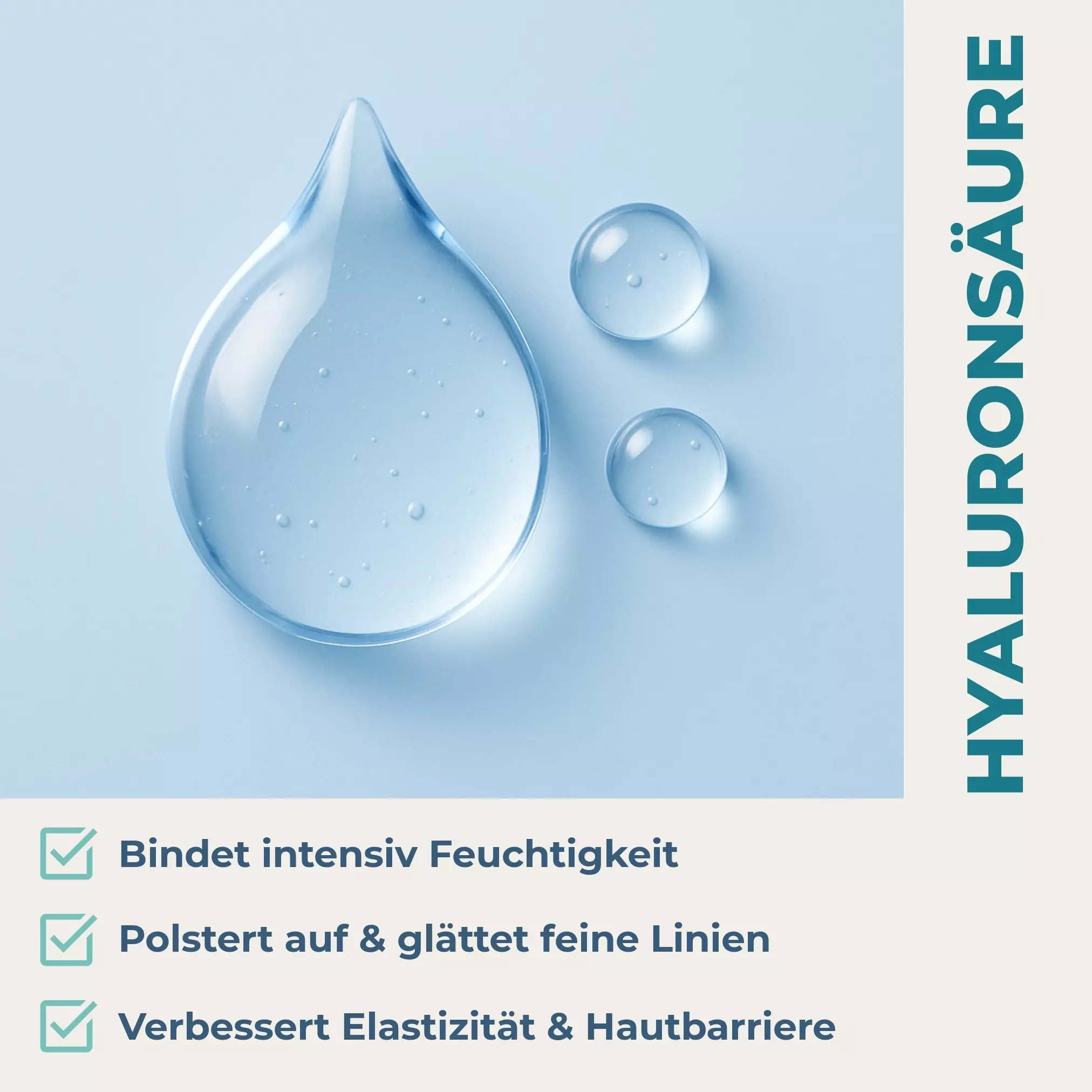 Hyaluronsäure besitzt eine herausragende Fähigkeit, Wasser zu speichern, wodurch die Haut intensiv mit Feuchtigkeit versorgt wird und sichtbar praller erscheint.
