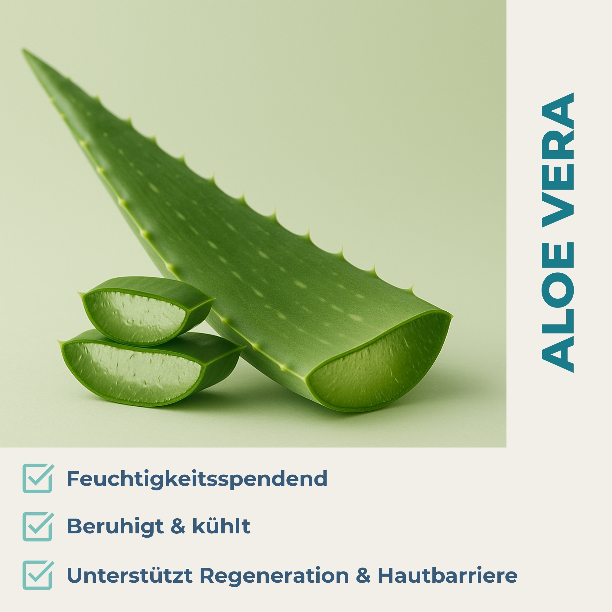 Aloe Vera ist bekannt für ihre hydratisierenden und beruhigenden Eigenschaften. Sie hilft der Haut, Feuchtigkeit zu speichern und unterstützt ihre natürliche Regeneration.