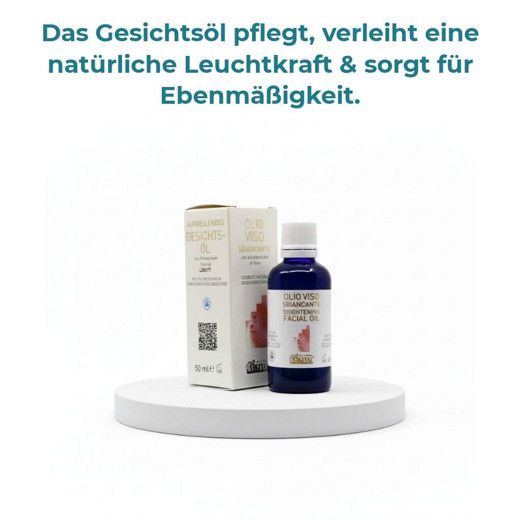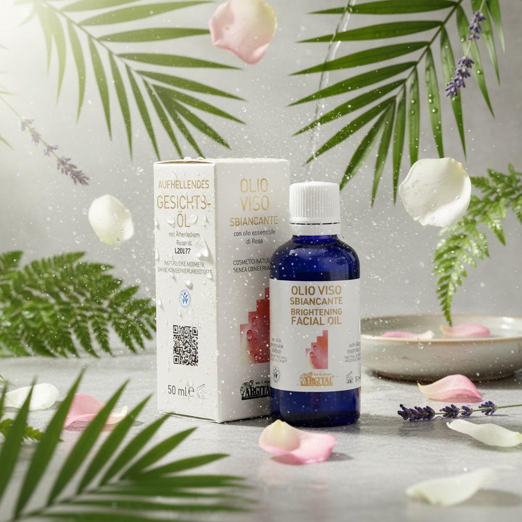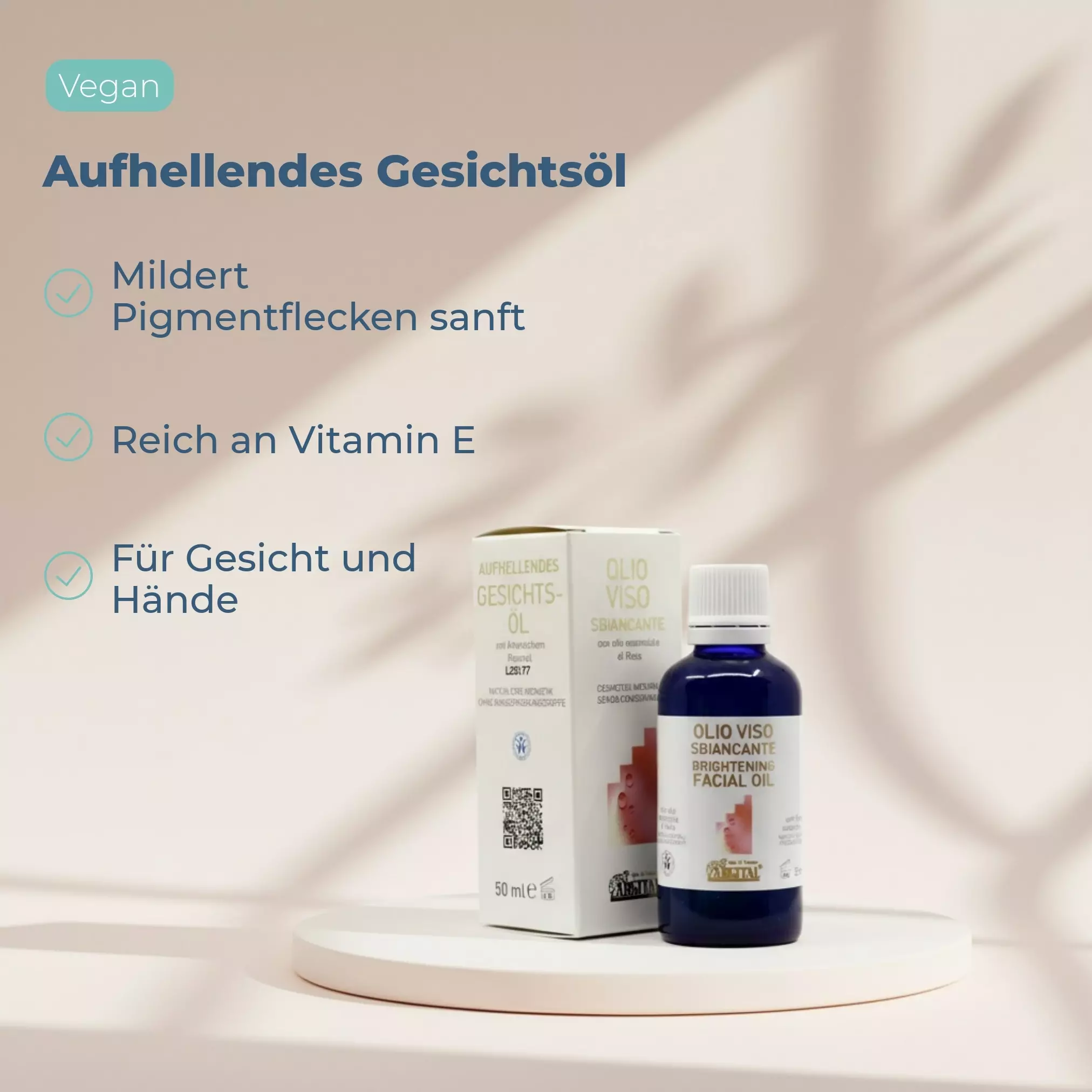 Das Aufhellende Gesichtsöl wirkt pflegend, ausgleichend und verleiht dem Teint eine sanfte, natürliche Leuchtkraft. Die Kombination aus Weizenkeimöl, reich an Vitamin E, und den wertvollen ätherischen Ölen von Rose und Lavendel unterstützt die Haut dabei, Pigmentflecken und ungleichmäßige Hauttöne zu mildern.
