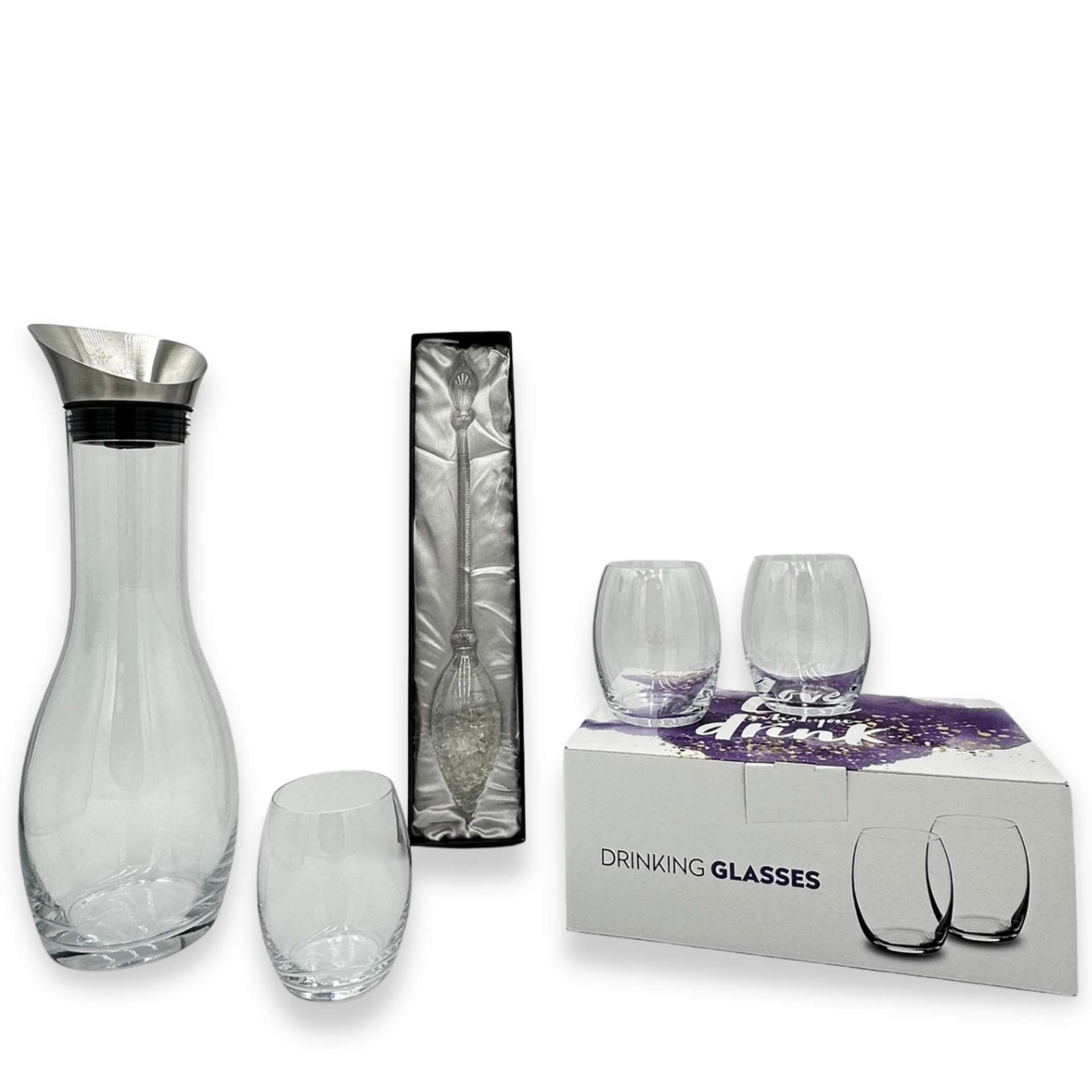 Dieses Set verbindet modernes Design mit der besonderen Ausstrahlung eines edlen Edelsteinstabs. Die hochwertige Glaskaraffe, das elegante Trinkglas-Set und der Diamonds-Edelsteinstab schaffen ein besonderes Trinkritual, das jeden Moment wertvoller wirken lässt. Ob als Geschenk, für gemütliche Abende oder für bewusste Trinkmomente im Alltag – dieses Set bringt Stil, Klarheit und ein Gefühl von Luxus auf den Tisch.