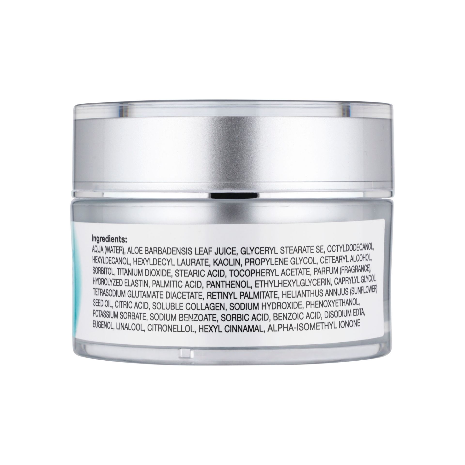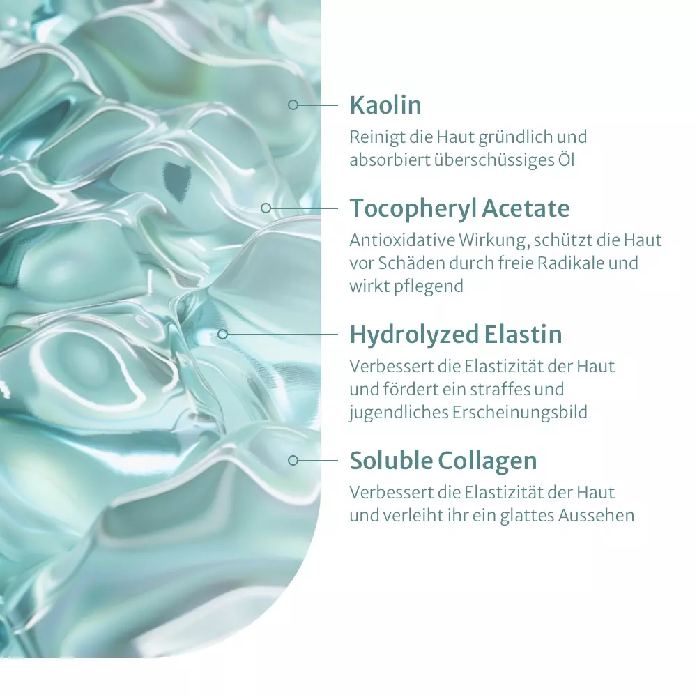 Aqua (Wasser), Aloe Barbadensis Leaf Juice (Aloe Vera Saft), Glyceryl Stearate SE (Emulgator), Octyldodecanol (Hautpflegemittel), Hexyldecanol (Weichmacher), Hexyldecyl Laurate (Hautpflegemittel), Kaolin (Tonerde), Propylene Glycol (Feuchthaltemittel), Cetearyl Alcohol (Hautpflegemittel), Sorbitol (Feuchthaltemittel), Titanium Dioxide (Mineralischer Farbstoff), Stearic Acid (Emulgator), Tocopheryl Acetate (Vitamin E), Parfum (Duftstoff), Hydrolyzed Elastin (Elastin), Palmitic Acid (Fettsäure), Panthenol (Provitamin B5), Ethylhexylglycerin (Hautpflegemittel), Caprylyl Glycol (Hautpflegemittel), Tetrassodium Glutamate Diacetate (Stabilisator), Retinyl Palmitate (Vitamin A/Retinol), Helianthus Annuus (Sunflower) Seed Oil (Sonnenblumenöl), Citric Acid (Zitronensäure), Soluble Collagen (Lösliches Kollagen), Sodium Hydroxide (ph-Regulator), Phenoxyethanol (Konservierungsmittel), Potassium Sorbate (Konservierungsmittel), Sodium Benzoate (Konservierungsmittel), Sorbic Acid (Konservierungsmittel), Benzoic Acid (Konservierungsmittel), Disodium EDTA (Stabilisator), Eugenol (Duftstoff), Linalool (Duftstoff), Citronellol (Duftstoff), Hexyl Cinnamal (Duftstoff), Alpha-Isomethyl Ionone (Duftstoff)