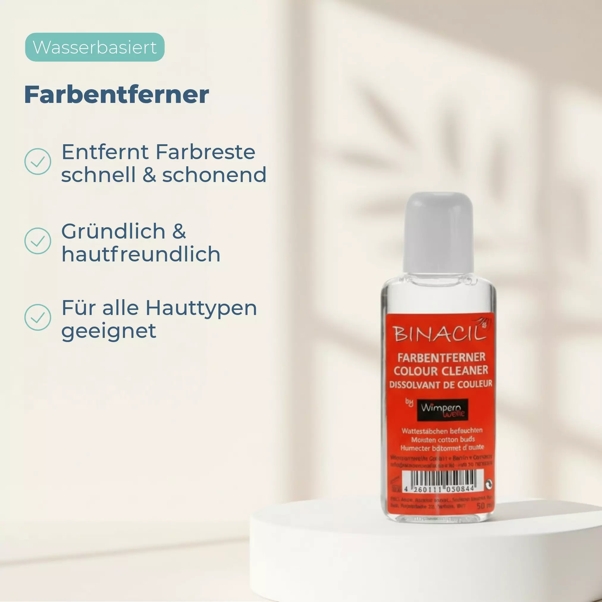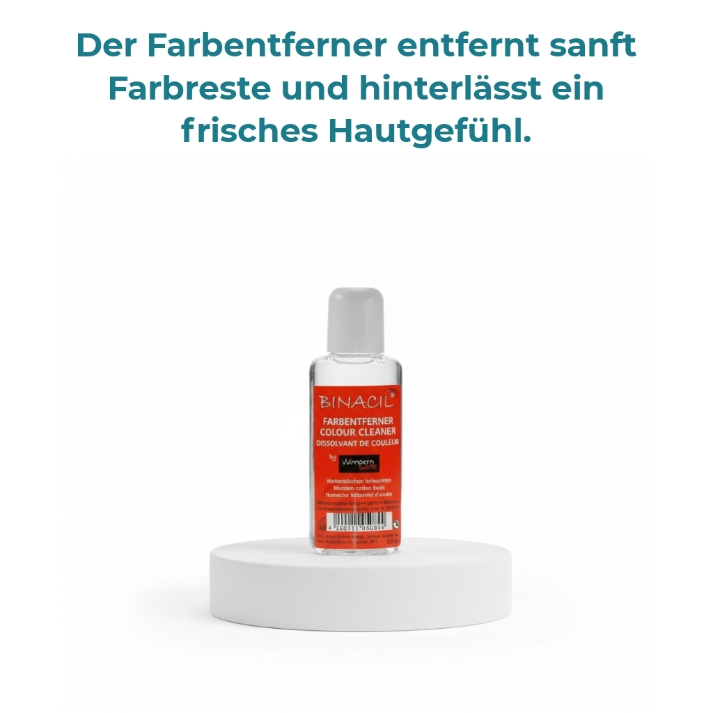 Der Binacil Farbentferner entfernt schnell und schonend Farbreste von der Haut nach dem Färben von Wimpern oder Augenbrauen. Die milde Formulierung sorgt für eine gründliche, aber hautfreundliche Reinigung – ohne Reizungen oder Rückstände.