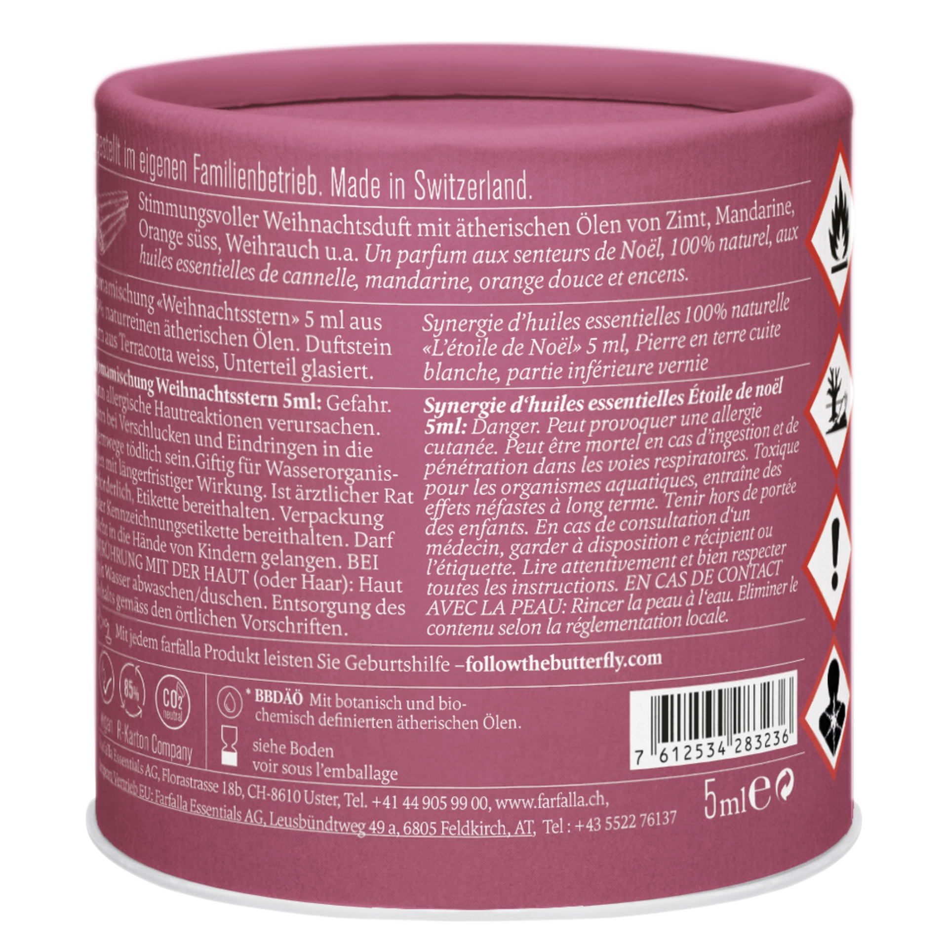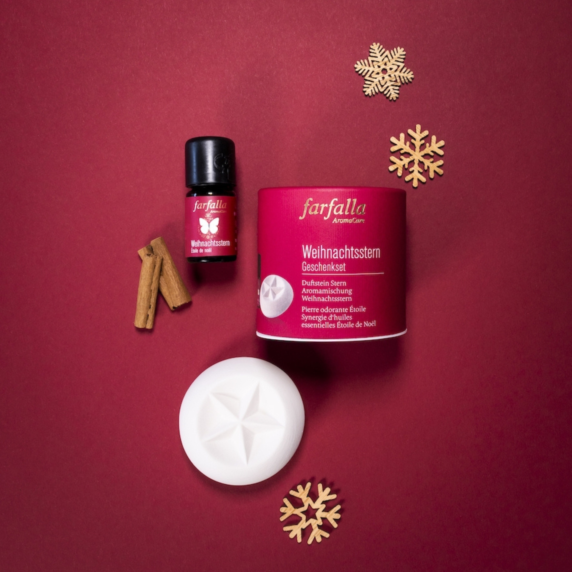 Das Geschenkset Weihnachtsstern vereint eine stimmungsvolle Aromamischung aus naturreinen ätherischen Ölen mit einem dekorativen Terracotta-Duftstein in Sternform. Der warme, würzige Duft von Mandarine, Orange, Zimt und Weihrauch erfüllt den Raum mit weihnachtlicher Behaglichkeit und lädt ein, die Festtage mit Ruhe, Freude und Herzlichkeit zu genießen. Ein ideales Geschenk für die Advents- und Weihnachtszeit.