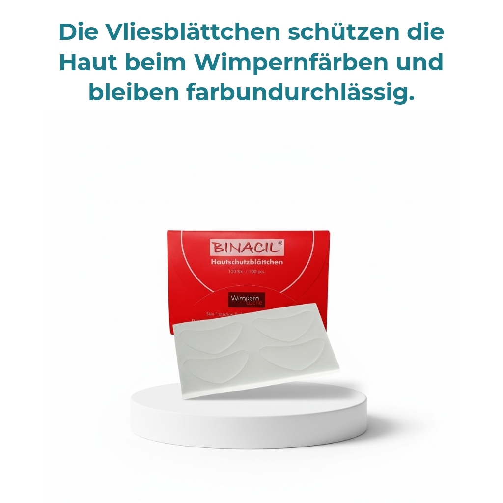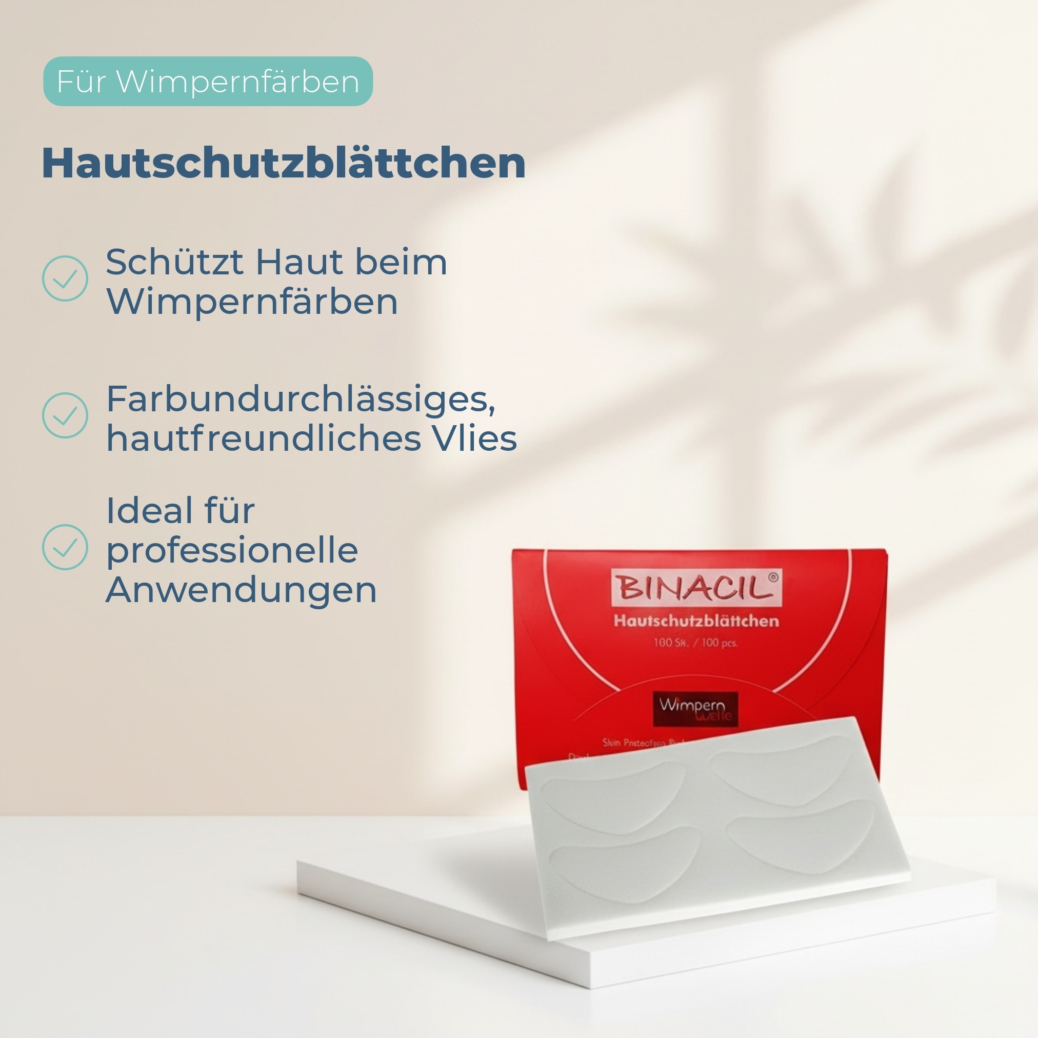 Die Binacil Hautschutzblättchen bestehen aus hochwertigem, weichem Vlies und schützen die empfindliche Haut unter den Augen während der Wimpernfärbung. Sie passen sich optimal an, nehmen überschüssige Farbe auf und verhindern Hautverfärbungen.
