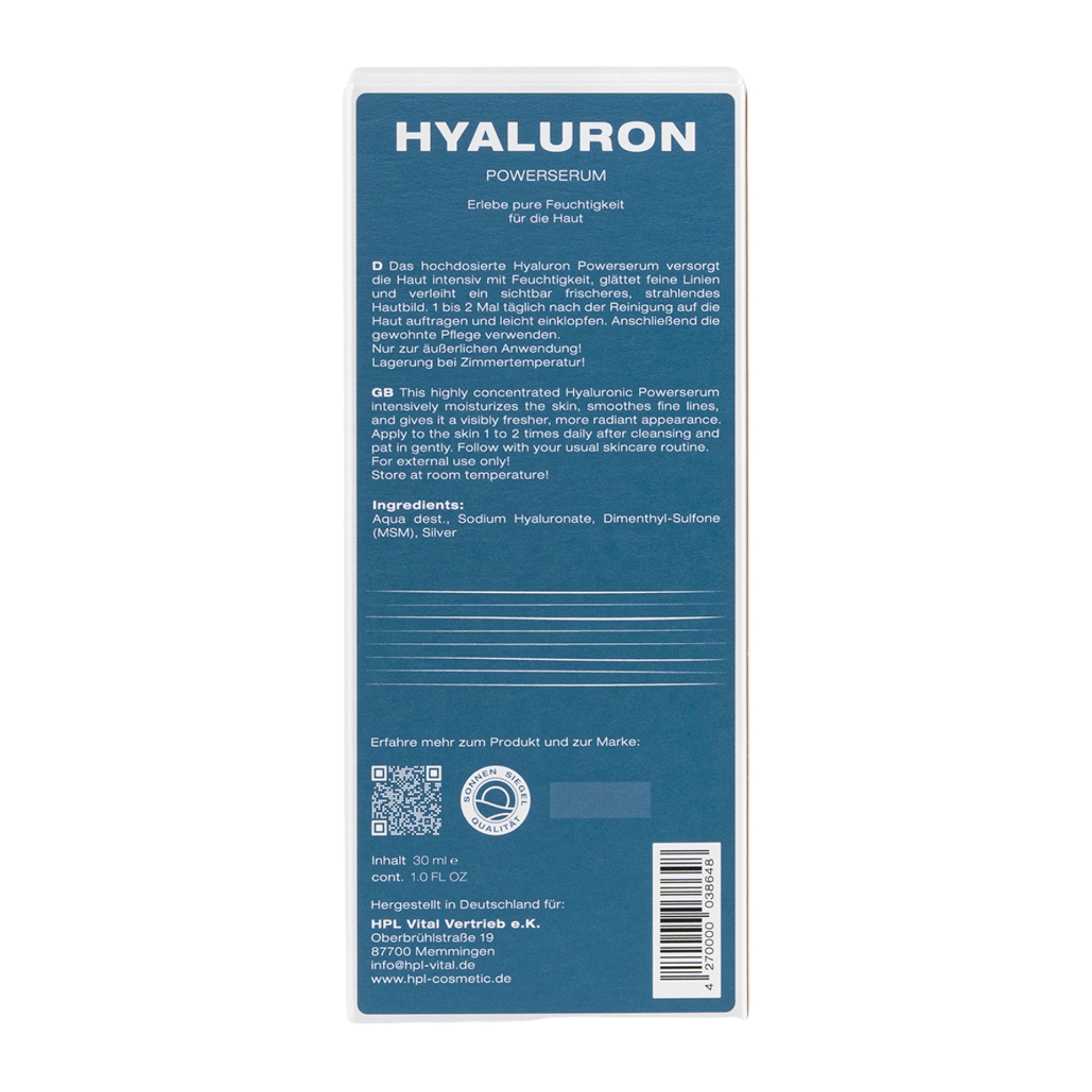 Das Hyaluron Powerserum versorgt die Haut intensiv mit Feuchtigkeit und fördert die Regeneration. Die hochwirksame Formel mit Hyaluronsäure, Silber und MSM minimiert Hautirritationen, wirkt antibakteriell und verbessert die Hautstruktur. Die Haut erscheint frischer, fester und sichtbar geglättet. Ideal für alle Hauttypen, auch bei empfindlicher oder unreiner Haut.
