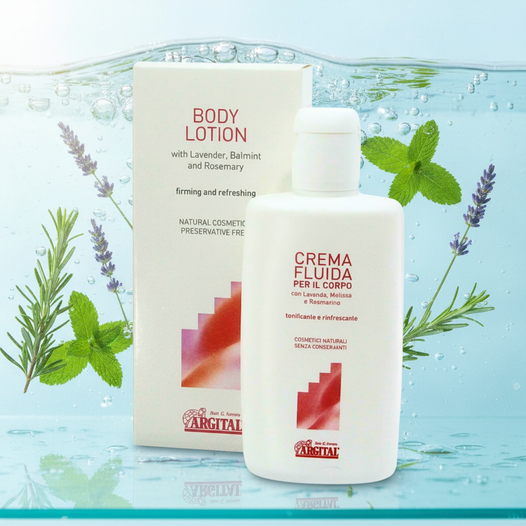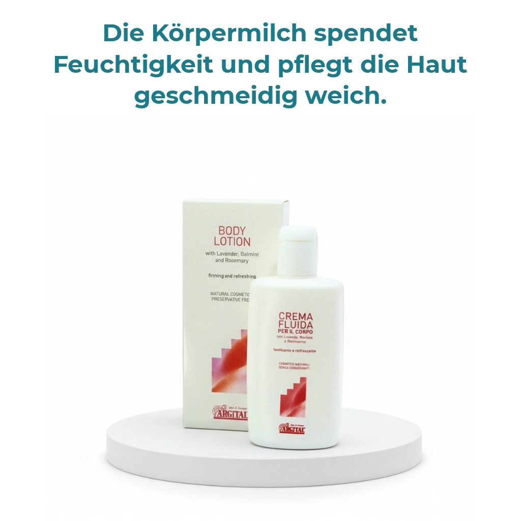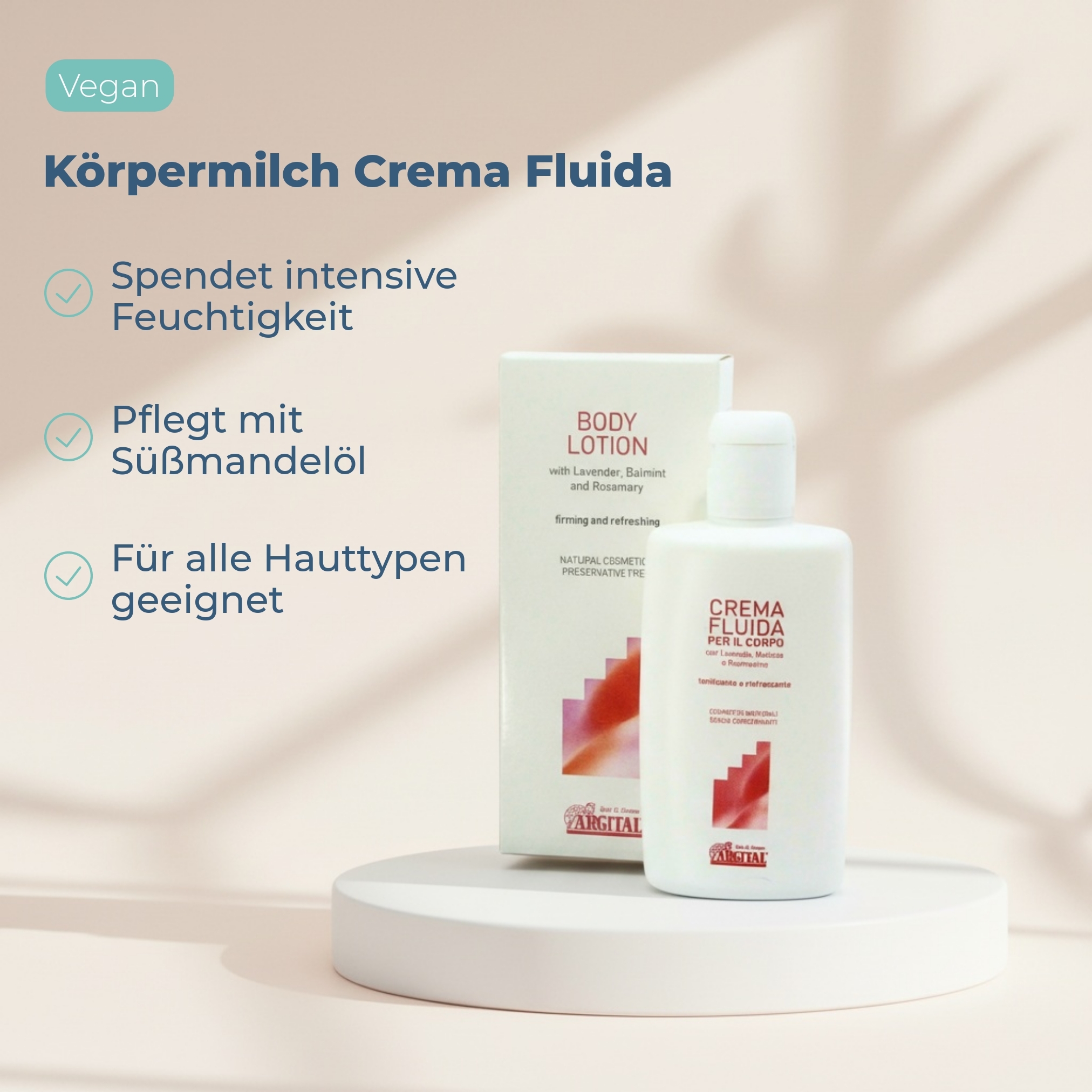 Die Argital Körpermilch Crema Fluida vereint sanfte Pflege mit einem erfrischenden Duft. Auf Basis von reinem Süßmandelöl nährt und schützt sie die Haut zuverlässig. Ätherische Öle aus Rosmarin, Lavendel und Melisse wirken harmonisierend und belebend auf Körper und Geist.