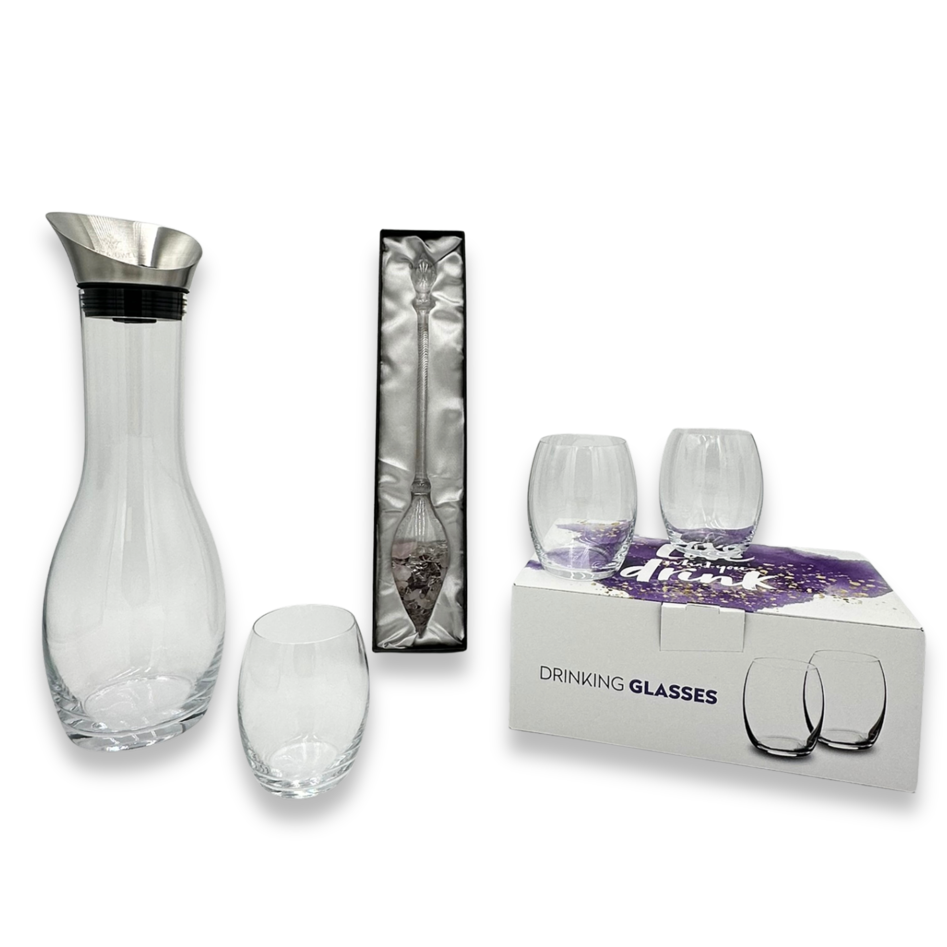 Dieses Set bringt eine besondere Atmosphäre auf jeden Tisch – ideal für romantische Abende, gemeinsame Genussmomente oder als liebevolles Geschenk für Menschen, die man schätzt. Die hochwertige Glaskaraffe, der Edelsteinstab und das elegante 6er-Trinkglas-Set ergänzen sich perfekt und schaffen ein harmonisches Gesamtbild für stilvolle Getränkemomente.