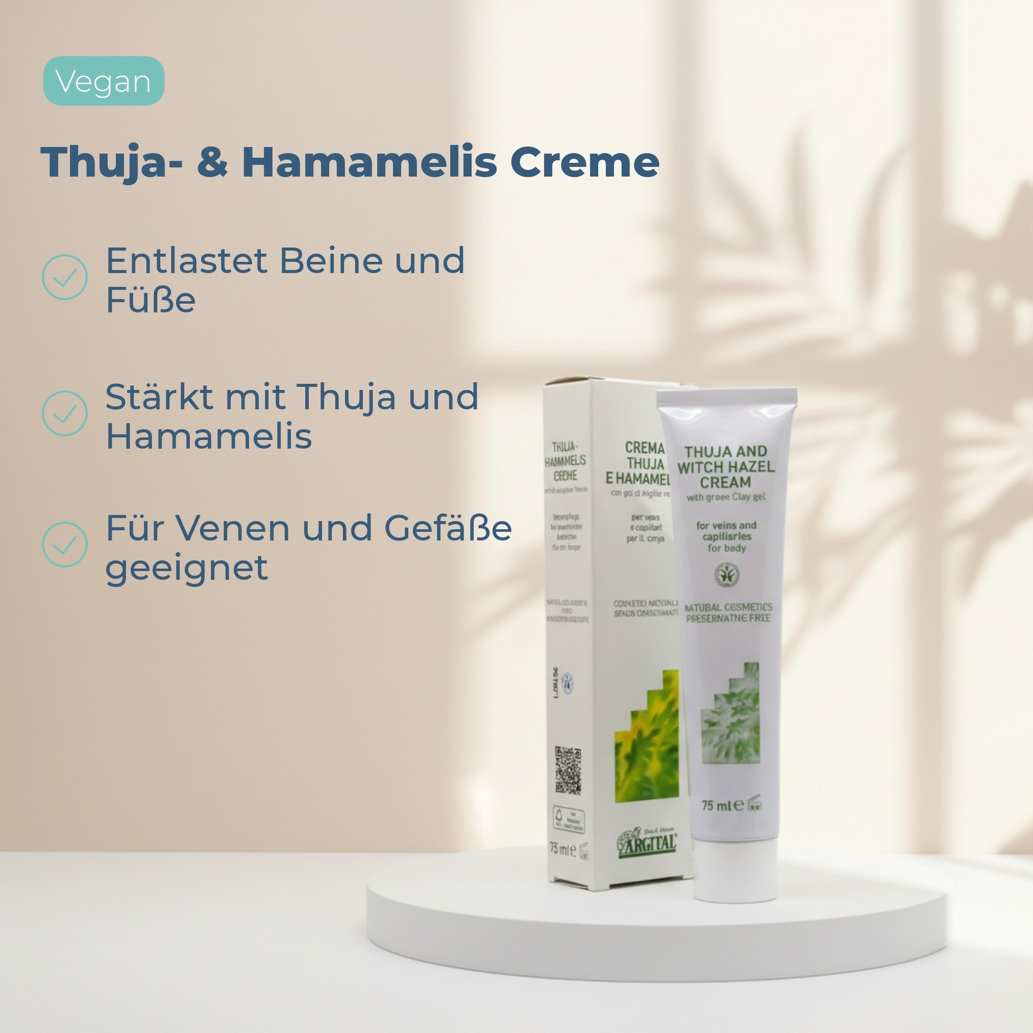 Die Thuja- & Hamamelis Creme ist eine gezielte Pflege bei erweiterten Äderchen, Krampfadern, Besenreisern und Hämorrhoiden. Sie wirkt entlastend und beruhigend für Beine und Füße, die durch Venenprobleme belastet sind.