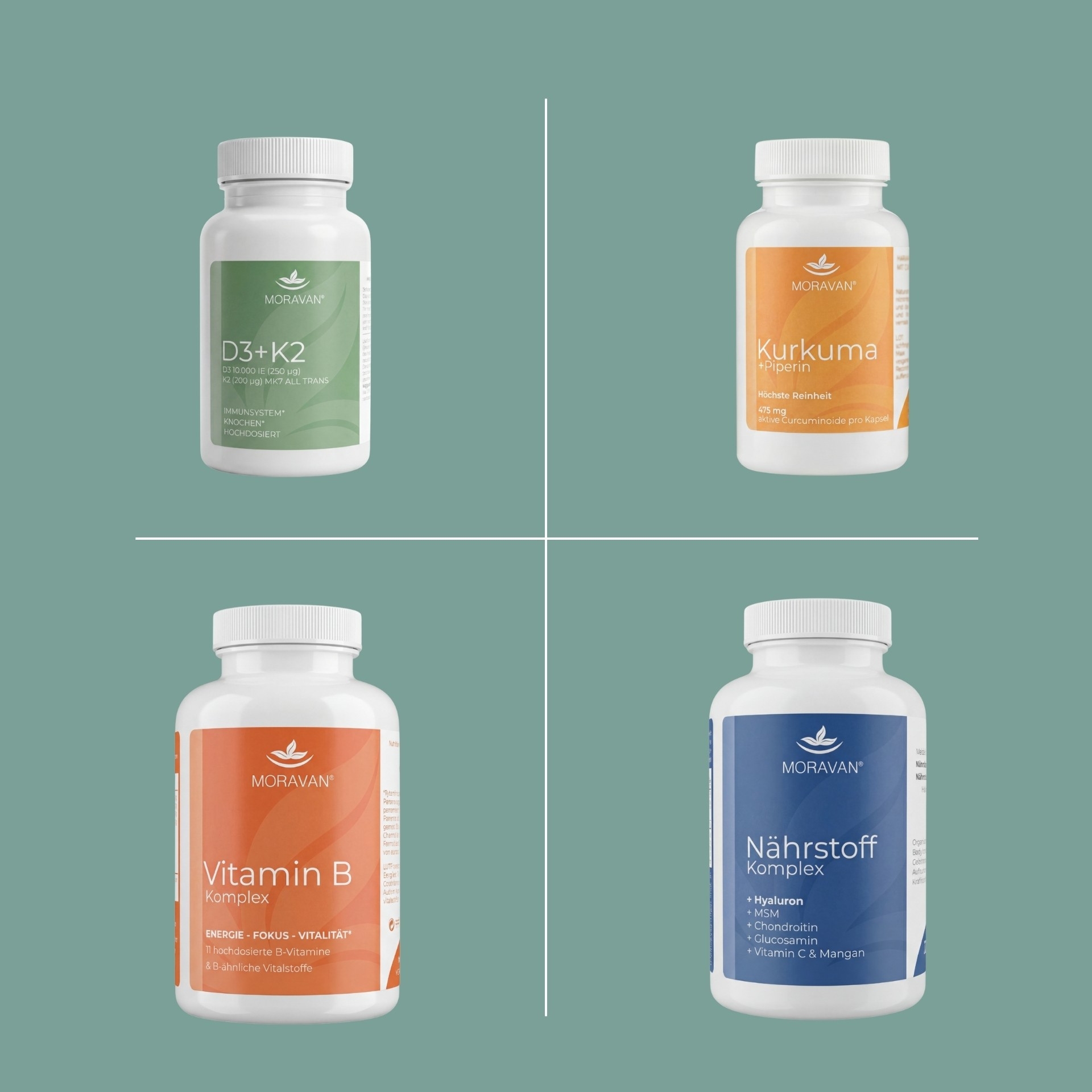 Vitamin D3 + K2 für Knochen und Immunsystem, Vitamin B-Komplex für Energiestoffwechsel und Nervenfunktion, ein Hyaluronsäure-MSM-Komplex mit Vitamin C und Mangan zur Unterstützung von Bindegewebe & Kollagenbildung – sowie Kurkuma + Piperin als pflanzliche Ergänzung.