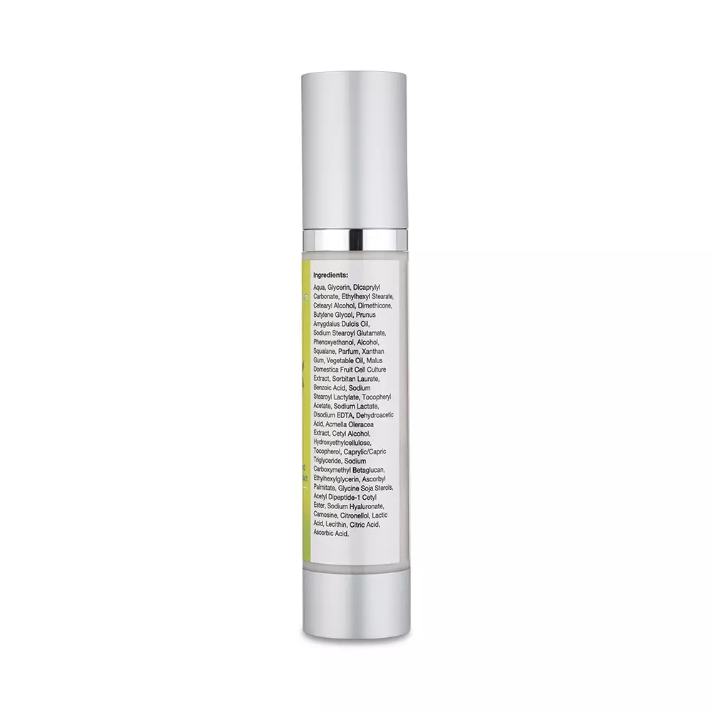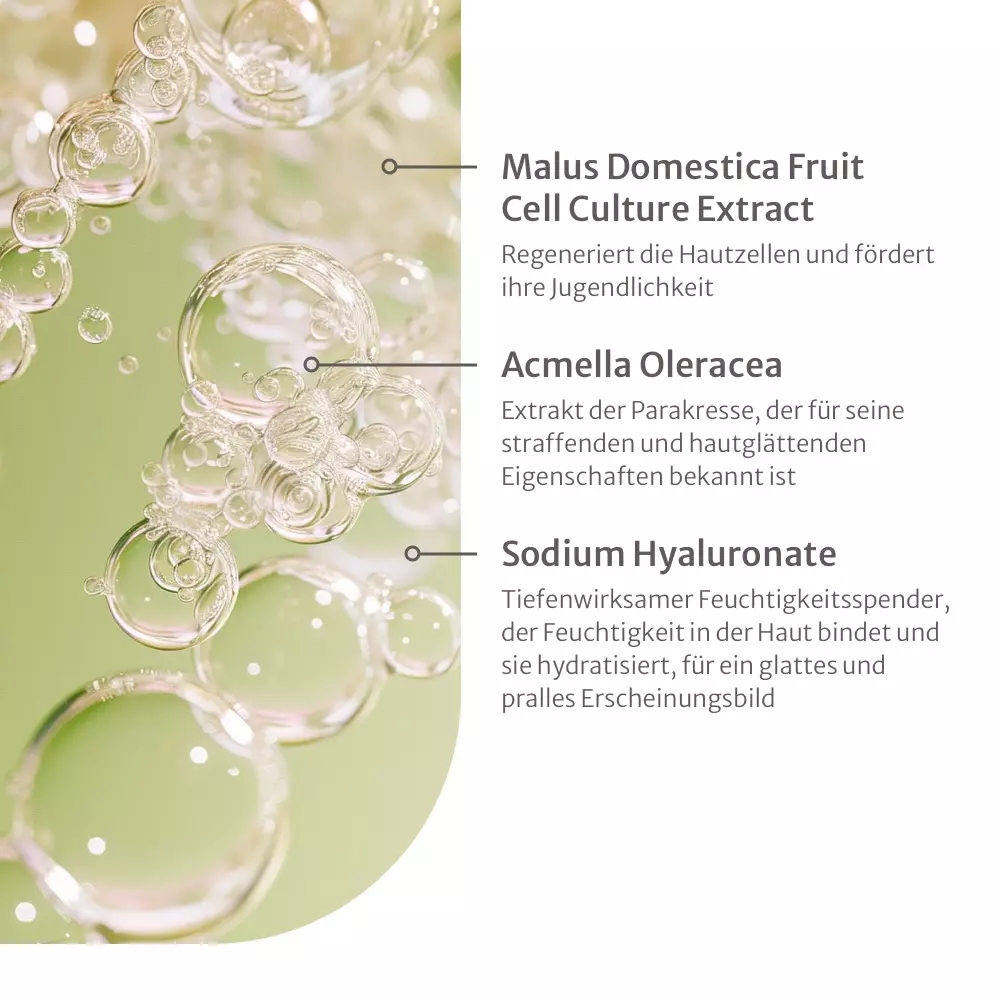 Aqua (Wasser), Glycerin, Dicaprylyl Carbonate, Ethylhexyl Stearate, Cetearyl Alcohol, Dimethicone, Butylene Glycol, Prunus Amygdalus Dulcis Oil (Mandelöl), Sodium Stearoyl Glutamate, Phenoxyethanol, Alcohol, Squalane (Pflanzliches Squalan), Parfum (Duftstoff), Xanthan Gum, Vegetable Oil, Malus Domestica Fruit Cell Culture Extract (Apfelstammzellen-Extrakt), Sorbitan Laurate, Benzoic Acid, Sodium Stearoyl Lactylate, Tocopheryl Acetate (Vitamin E), Sodium Lactate, Disodium EDTA, Dehydroacetic Acid, Acmella Oleracea Extract (Parakresse-Extrakt), Cetyl Alcohol, Hydroxyethylcellulose, Tocopherol, Caprylic/Capric Triglyceride, Sodium Carboxymethyl Betaglucan, Ethylhexylglycerin, Ascorbyl Palmitate (Vitamin C), Glycine Soja Sterols, Acetyl Dipeptide-1 Cetyl Ester (Lipodipeptid), Sodium Hyaluronate (Hyaluronsäure), Carmosine, Citronellol, Lactic Acid, Lecithin, Citric Acid, Ascorbic Acid.