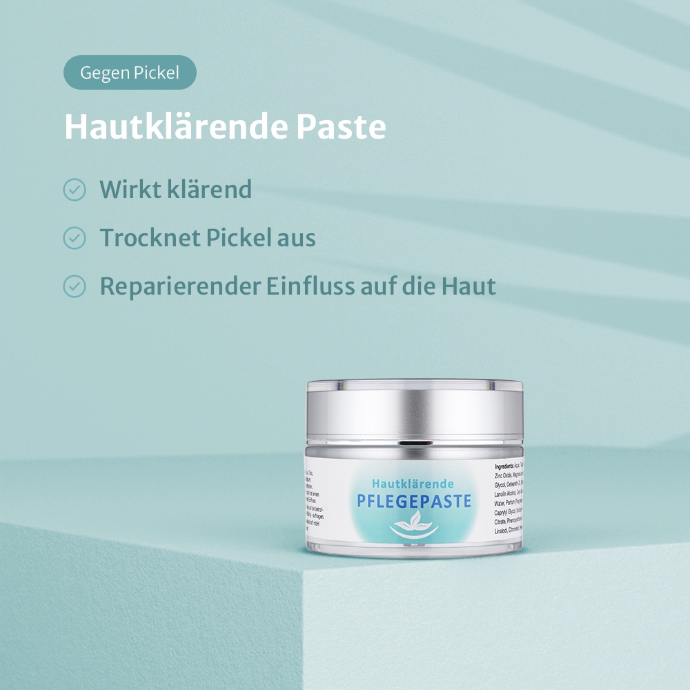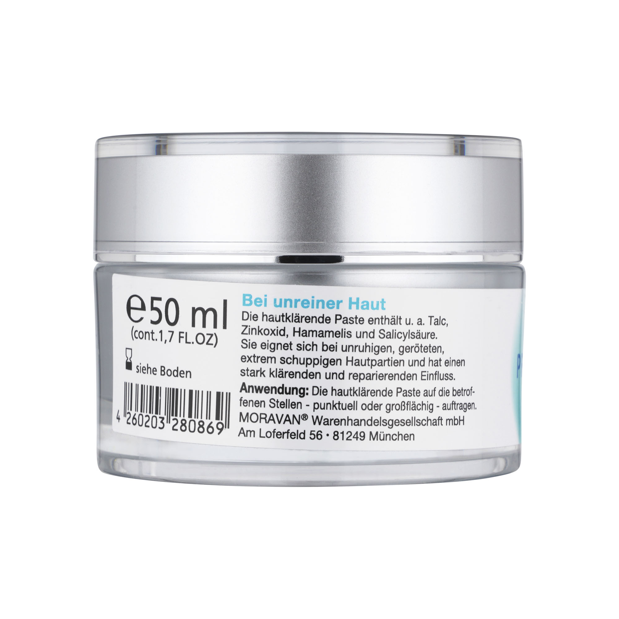 Die Hautklärende Paste ist eine hochwirksame Pflege für unruhige, gerötete, extrem trockene oder schuppige Haut sowie für Haut, die zu Pickeln neigt. Wertvolle Inhaltsstoffe klären intensiv, unterstützen die Hautregeneration und fördern ein verfeinertes, ebenmäßigeres Hautbild.