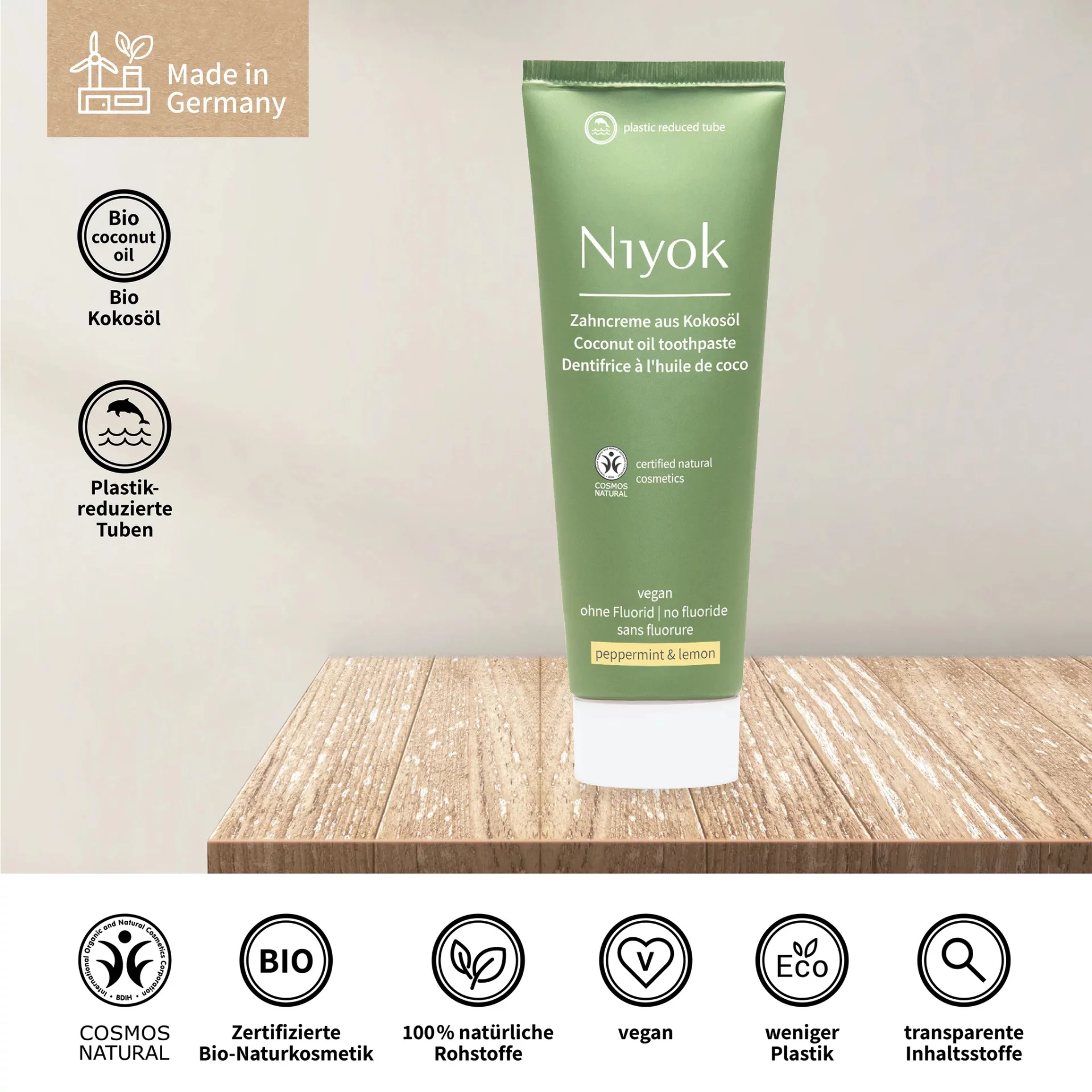 Die Niyok Zahncreme vereint natürliche Inhaltsstoffe mit nachhaltigem Design und bietet eine sanfte Pflege für Zähne und Zahnfleisch. Die zertifizierte Naturkosmetik wird in Deutschland hergestellt und basiert auf Bio-Kokosöl, das für seine pflegenden und antibakteriellen Eigenschaften bekannt ist. Dank der milden Kreide-Abrasive reinigt die Zahncreme besonders schonend und ist ideal bei empfindlichen Zähnen oder Zahnfleischbluten.